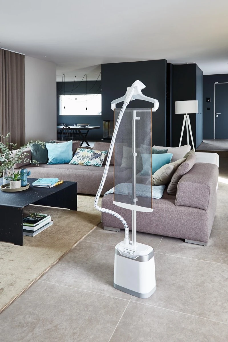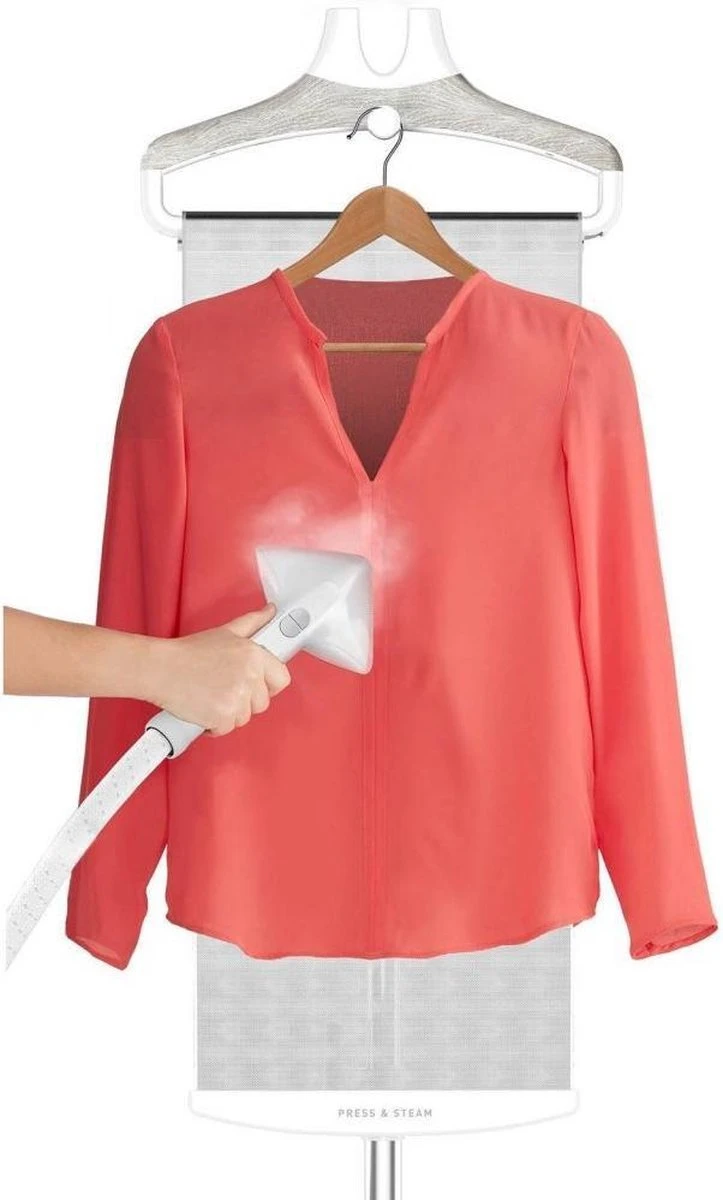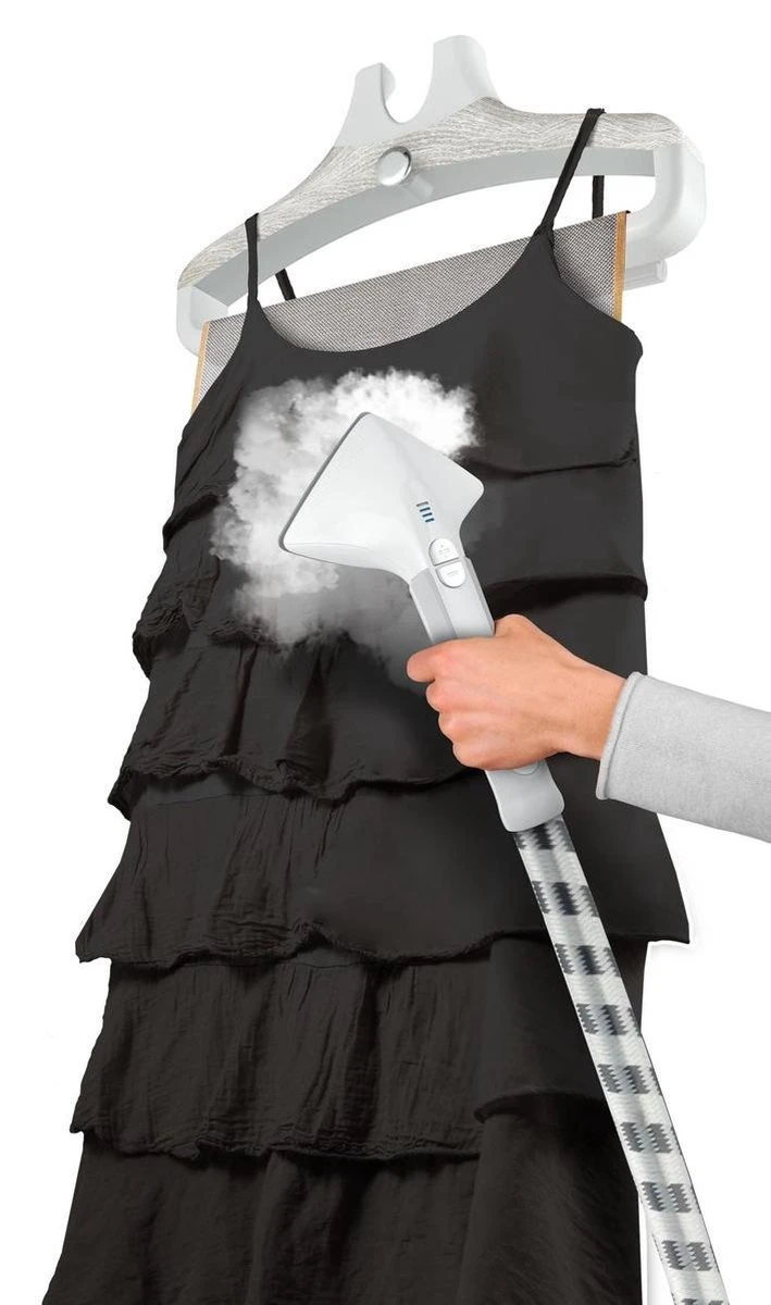 – Handige kledingstomer met praktische accessoires: kledingborstel, stoomkap en knijper om strakke vouwen te maken